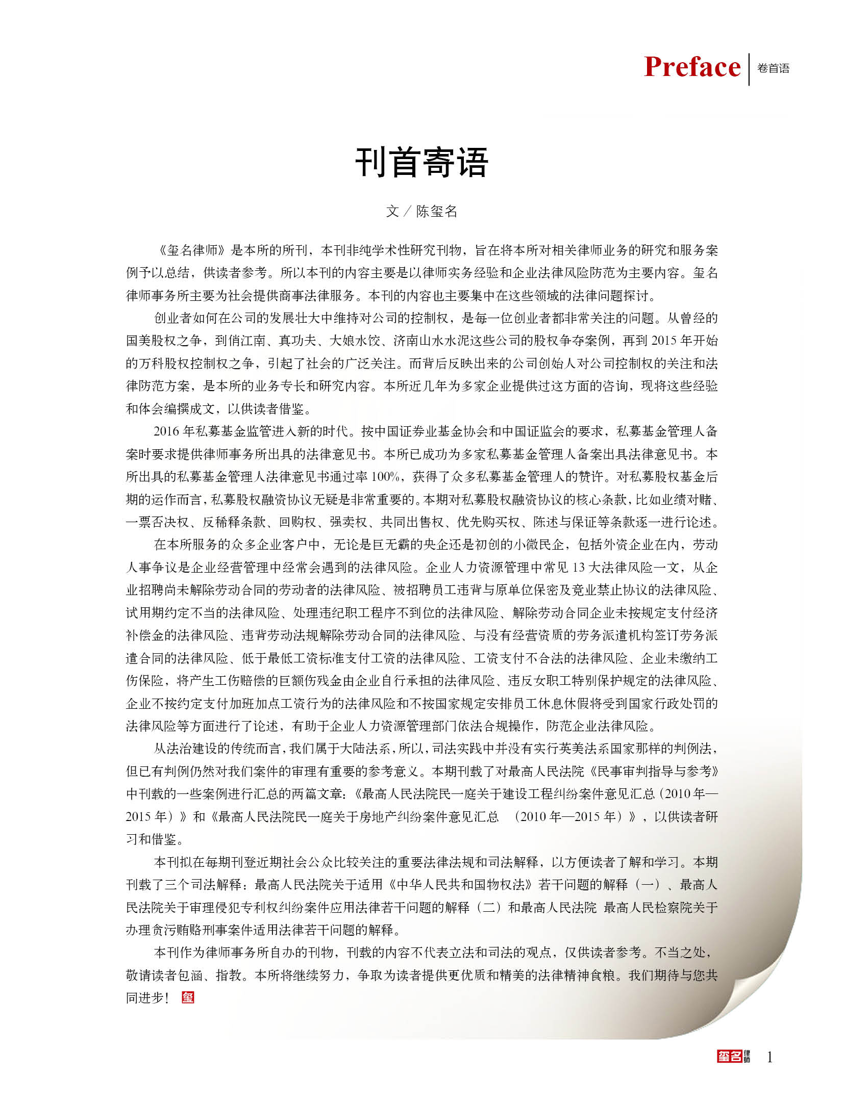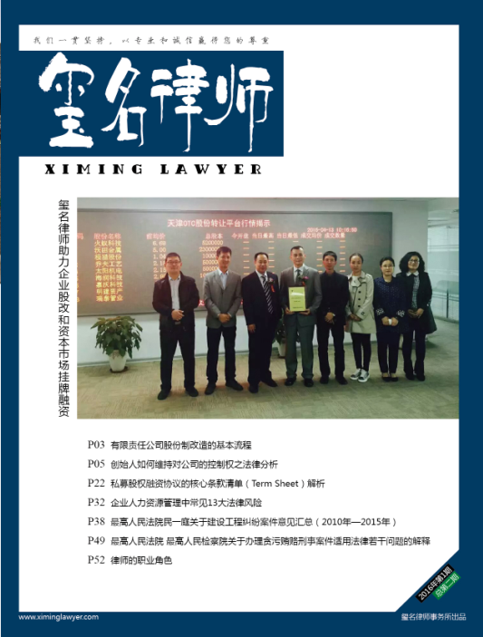 《玺名律师》是本所的所刊,本刊非纯学术性研究刊物,旨在将本所对相关律师业务的研究和服务案例予以总结,供读者参考。所以本刊的内容主要是以律师实务经验和企业法律风险防范为主要内容。玺名律师事务所主要为社会提供商事法律服务。本刊的内容也主要集中在这些领域的法律问题探讨。 创业者如何在公司的发展壮大中维持对公司的控制权,是每一位创业者都非常关注的问题。从曾经的国美股权之争,到俏江南、真功夫、大娘水饺、济南山水水泥这些公司的股权争夺案例,再到2015年开始的万科股权控制权之争,引起了社会的广泛关注。而背后反映出来的公司创始人对公司控制权的关注和法律防范方案,是本所的业务专长和研究内容。本所近几年为多家企业提供过这方面的咨询,现将这些经验和体会编撰成文,以供读者借鉴。 2016年私募基金监管进入新的时代。按中国证券业基金协会和中国证监会的要求,私募基金管理人要求备案时要求提供律师事务所出具的法律意见书。本所已成功为多家私募基金管理人备案出具法律意见书。本所出具的私募基金管理人法律意见书通过率100%,获得了众多私募基金管理人的赞许。对私募股权基金后期的运作面议,私募股权融资协议无疑是到头重要的。本期对私募股权融资协议的核心条款,比如业绩对赌、一票否决权、反稀释条款、回购权、强卖权、共同出售权、优先购买权、陈述与保证等方面条款逐一进行论述。 在本所服务的众多企业客户中,无论是巨无霸的央企还是初创的小微民企,包括外资企业在内,劳动人事争议是企业经营管理中经常会遇到的法律风险。企业人力资源管理中常见13大法律风险一文,从企业招聘尚未解除劳动合同的劳动者的法律风险、被招聘员工违背与原单位保密及竞业禁止协议的法律风险、试用期约定不当的法律风险、处理违纪职工程序不到位的法律风险、解除劳动合同企业未按规定支付经济补偿金的法律风险、违背劳动法规解除劳动合同的法律风险、与没有经营资质的劳务派遣机构签订劳务派遣合同的法律风险、低于最低工资标准支付工资的法律风险、工资支付不合法的法律风险、企业未缴纳工伤保险,将产生工伤赔偿的巨额伤残金由企业自行承担的法律风险、违反女职工特别保护规定的法律风险、企业不按约定支付加班加点工资行为的法律风险和不按国家规定安排员工休息休假将受到国家行政处罚的法律风险等方面进行了论述,有助于企业人力资源管理部门依法合规操作,防范企业法律风险。 从法治建设的传统而言,我们属于大陆法系,所以,司法实践中并没有实行的英美法系国家那样的判例法,但已有判例仍然对我们案件的审理有重要的参考意义。本期刊载了对最高人民法院《民事审判指导与参考》中刊载的一些案例进行汇总的两篇文章:《最高人民法院民一庭关于建设工程纠纷案件意见汇总(2010年—2015年)》和《最高人民法院民一庭关于房地产纠纷案件意见汇总 (2010年—2015年)》,以供读者研习和借鉴。 本刊拟在每期刊登近期社会公众比较关注的重要法律法规和司法解释,以方便读者了解和学习。本期刊载了三个司法解释:最高人民法院关于适用《中华人民共和国物权法》若干问题的解释(一)、最高人民法院关于审理侵犯专利权纠纷案件应用法律若干问题的解释(二)和最高人民法院 最高人民检察院关于办理贪污贿赂刑事案件适用法律若干问题的解释。 本刊作为律师事务所自办的刊物,刊载的内容不代表立法和司法的观点,仅供读者参考。不当之处,敬请读者包涵、指教。本所将继续努力,争取为读者提供更优质和精美的法律精神食粮。我们期待与您共同进步!