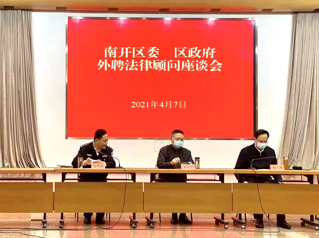 会议由副区长赵年伏同志主持,由区长孙剑楠同志宣布《南开区委、区政府关于外聘法律顾问及法律顾问人才库人员的决定》。南开区区委书记杨兵及区委、区政府外聘法律顾问代表讲话发言。